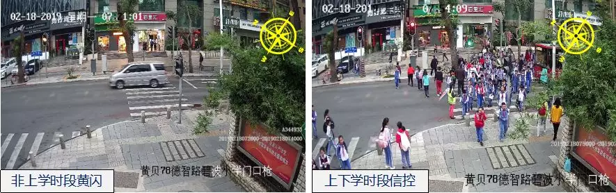 为了保障学生安全过街,深圳交警恢复黄贝/德智路口上下学时段信号灯管控模式,非上下学时段启用黄闪控制模式。