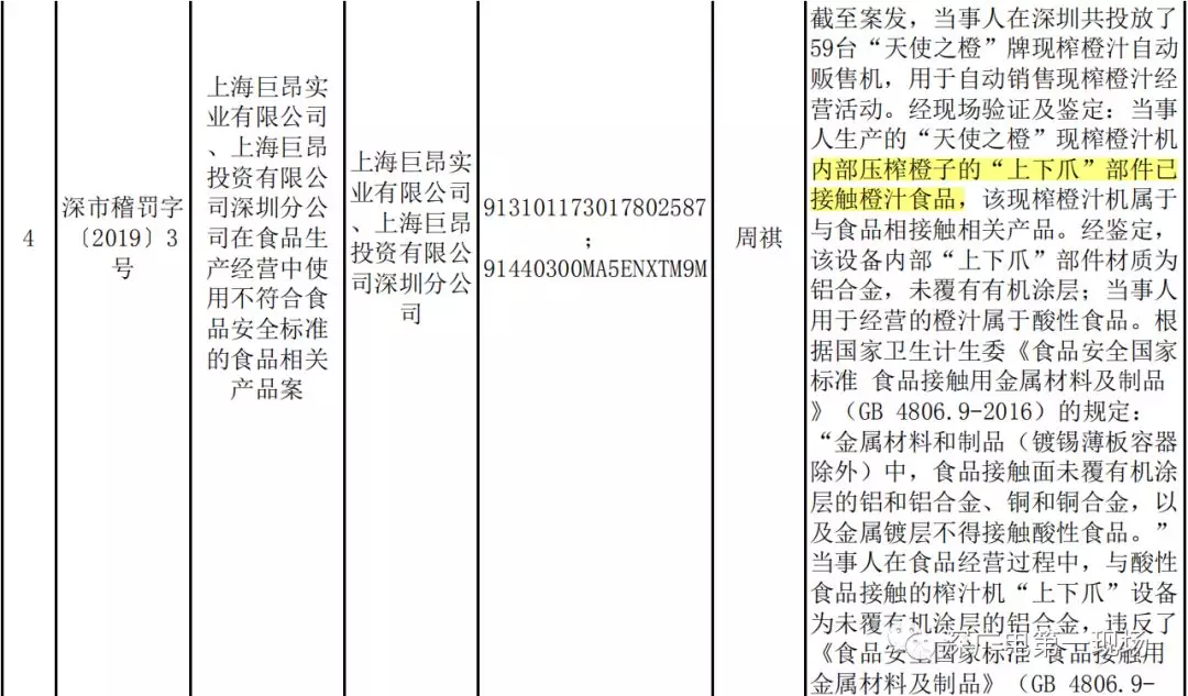 深广电第一现场2019年2月19日讯 18日我们报道了,“天使之橙”现榨橙汁自动贩售机,其生产的现榨橙汁机,内部压榨橙子的铝合金“上下爪”部件,已接触橙汁食品。根据《食品接触用金属材料及制品》相关标准,其涉嫌违反《食品安全法》,被深圳市市场稽查局开出巨额罚单,没收其违法所得1199070元。