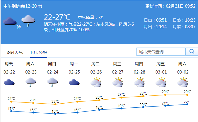 记者从深圳市气象局了解到,21日深圳市以多云转阴天为主,有分散小雨;气温在21-27℃;东南风2-3级;相对湿度65%-95%。