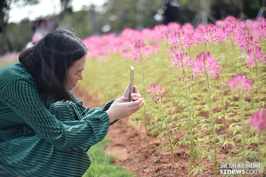一位市民正用手机拍下眼前的醉蝶花