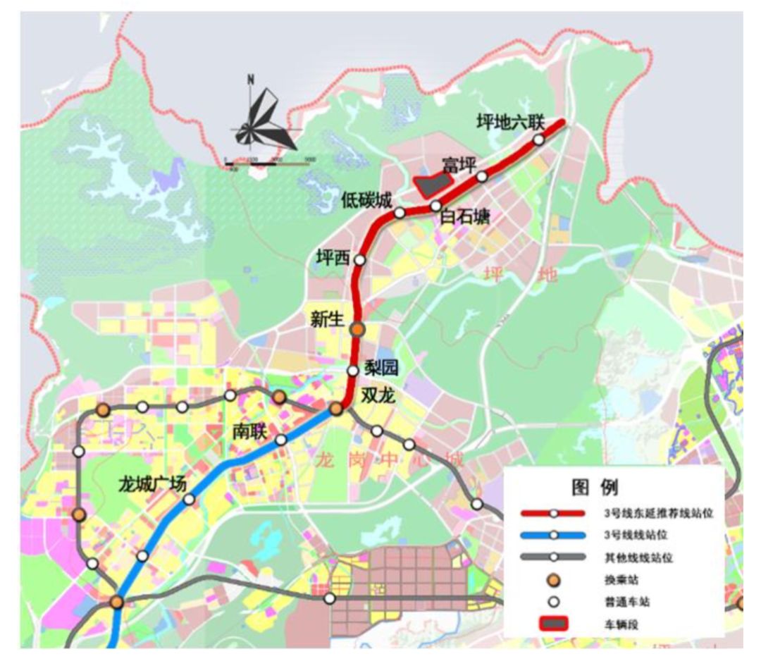 3号线东延线连接后福、新生、低山、坪西、坪地、坪东以及龙岗中心等地区,并通过已建成运行的3号线连接至福田中心区,是联系坪地中心与龙岗中心、横岗中心、布吉中心、罗湖中心以及福田中心的城市轨道干线。线路全长约9.4km,其中地上线约2.0km,地下线约7.4km。