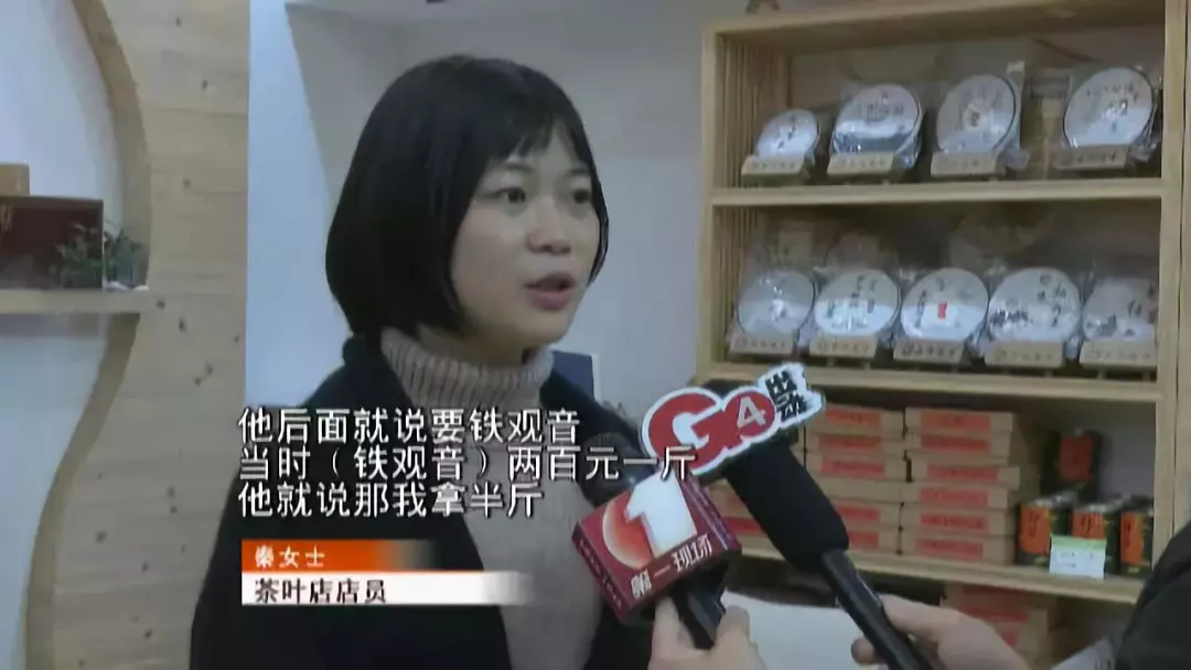 秦女士介绍,26日下午5点钟左右,她和另一位店员正在包装茶叶。正当两人忙活的时候,一位目测有40多岁的顾客突然进店,说想要买点茶叶。秦女士回忆,那个人一进来就问了有没有一百块的茶叶,她说没有,然后这位顾客就问最便宜的茶是哪一种,最后说要买铁观音,而铁观音是200块一斤,顾客表示要半斤。