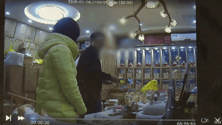 店里的监控视频显示,这位顾客试了试茶,从钱包里掏出了100元,递给了店员小娟。秦女士则去了另一端的冰柜里拿铁观音。小娟验过钱之后,便把100元钱放在了桌面上。