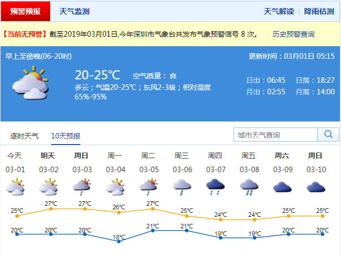 深圳新闻网2019年3月1日讯(记者陈婕)今天的阳光似乎温暖过了头,太阳的出现,缓解了潮湿的情况,未来两天深圳继续温暖湿润,早晚能见度较低,周末两天多云,部分时间可见阳光。而从3月3日开始,深圳将连续有雨。