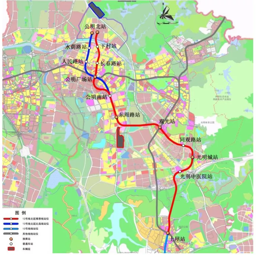 13号线北延线位于深圳市光明区境内,整个线路总体呈南北走向,终止于公明北站。线路全长约19.2公里,采用地下敷设。