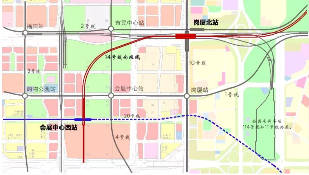 14号线南延从岗厦北站后折返线中部引出,下穿11号线右线和向南下穿市民中心南广场,下穿4号线,下穿1号线至会展中心设会展中心站,与规划20号线换乘。线路全长约1.3公里,采用地下敷设。