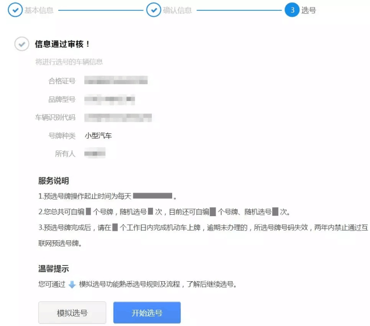 系统核查通过后会进入选号服务说明,用户可以看到之前提交的信息,阅读服务说明后,点击"开始选号"按钮开始进行选号操作。
