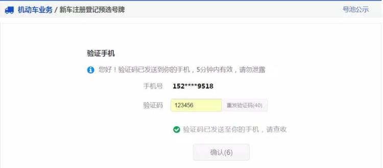 用户须获取并录入手机短信验证码,验证预选号牌的手机号码。
