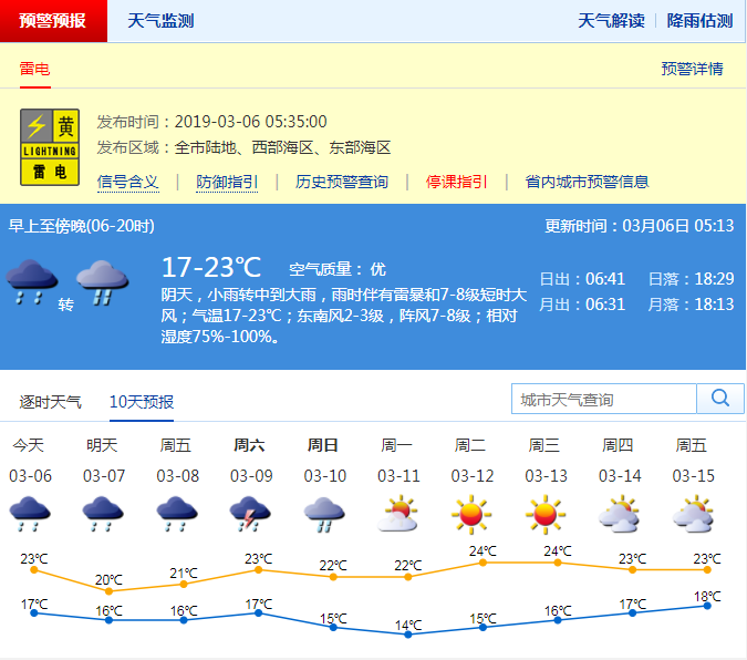 深圳新闻网2019年3月6日讯 3月5日,深圳正式宣布入汛,比往年入汛时间明显提前,预计今年汛期雨量偏多,台风影响早。未来5天仍以降雨为主,可能伴有7到8级的短时阵风和雷暴,提醒市民注意防范。