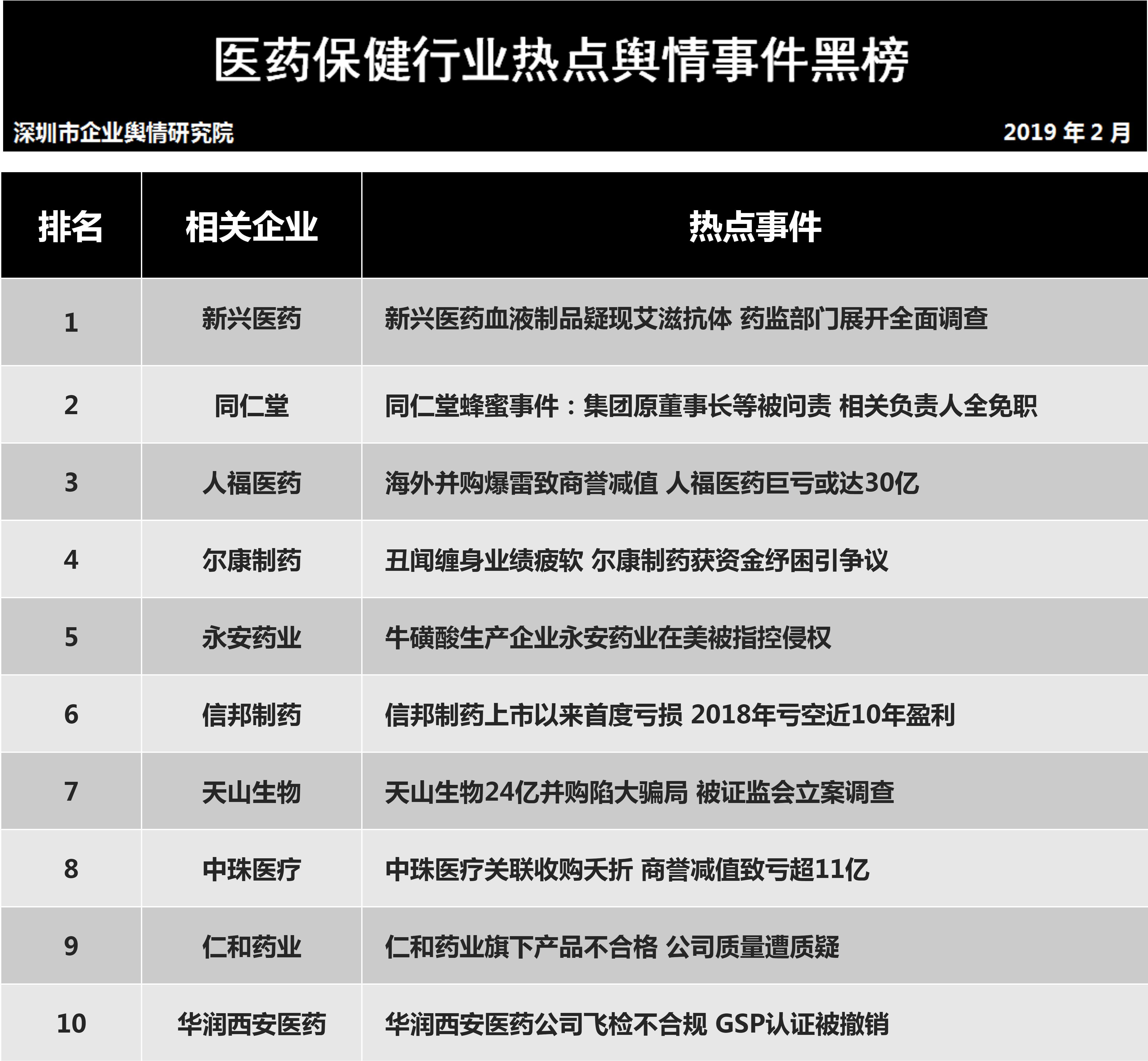 深圳新闻网2019年3月5日讯 (记者田志强 通讯员陈文光)3月5日,深圳企业舆情研究院发布第十三批企业舆情榜单。本次榜单重点聚焦房地产及医药保健两个行业。医药保健行业舆情榜单由医疗保健行业热点舆情事件排行榜(红、黑榜)及医药保健行业企业公众形象排行榜组成。