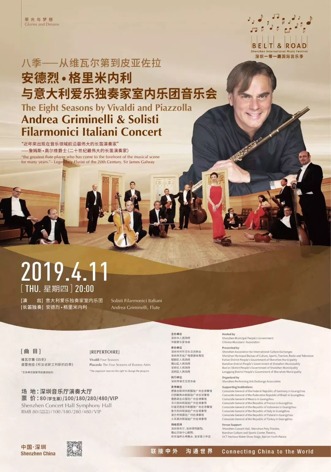 长笛名家安德烈 格里米内利,世界三大男高音之一帕瓦罗蒂推崇的长笛大师,携意大利爱乐独奏家室内乐团,首次到访深圳,用音乐链接跨越时空的《四季》。