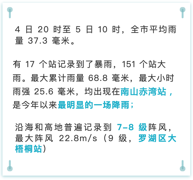 受加强的偏南气流影响,昨天夜间深圳普降大雨局部暴雨。