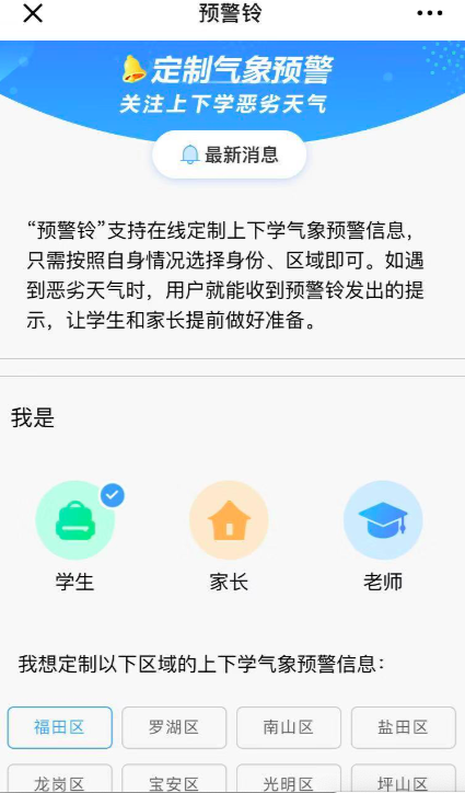 开学首日,深圳市气象局就联合深圳市教育局推出上下学时段高级别台风暴雨预警提示服务——“预警铃”,广大学生和家长可以通过关注“深圳天气”微信公众号进入“市民互动→预警铃”页面定制上下学预警信息,及时掌握自己所在区域的天气状况,合理安排出行,保障学生安全。