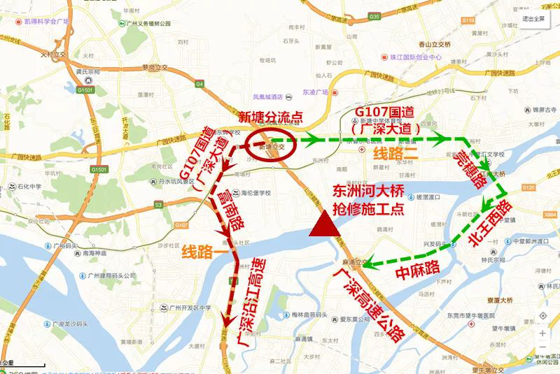 (2)广深高速公路深圳方向新塘出口→ G107国道(广深大道)→莞穗路→北王西路→中麻路→广深高速公路麻涌站入口→东莞、深圳。