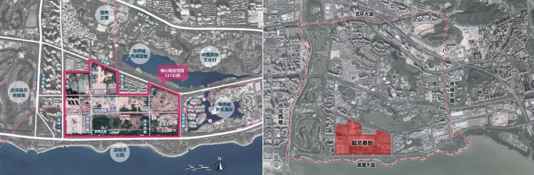 深超总基地包括滨海大道、深湾一路、深湾五路、白石三道、白石路所围合的区域,总用地面积117.4万平方米。深圳市政府于2018年成立“深圳湾超级总部基地开发建设指挥部”,由指挥部统筹协调推进深圳湾超级总部基地规划、建设、运营工作,按照“世界眼光、国际标准、中国特色、高点定位”的要求,力争将深超总基地打造成为展示深圳城市竞争力影响力的“巅峰杰作”。