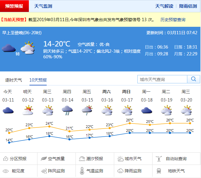 深圳新闻网2019年3月11日讯 自3月5日起,深圳已连续6日出现降雨,不少市民抱怨,再不出太阳,衣服都要发霉了。好在持续多日的降雨终于结束,“流浪”许久的太阳要回归了。记者从市气象局了解到,周一(11日)阴天转多云可见阳光,周二周三(12-13日)多云间晴天,气温回升。