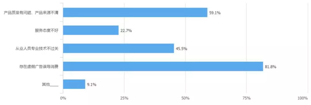 消费者们认为美容美发行业中存在最大的问题是虚假广告误导消费,第二则是产品质量问题和产品来源不清。