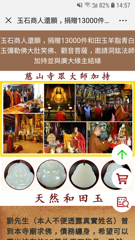 记者打开警方提供的网站链接,随即便出现了香港某知名寺院的页面,上面有不同的法师主持不同法事的照片。照片上方,赫然写着"玉石商人还愿,捐赠13000件和田玉羊脂青白玉弥勒佛大肚笑佛、观音菩萨,邀请 XX法师加持并与广大缘主结缘"的字样。接下来网页上便讲述了一个漏洞百出、文理不通的"传奇故事"——