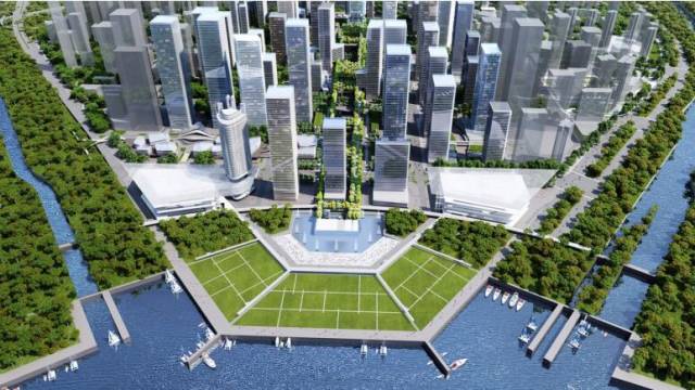 该方案中规划了国际交流会议中心、城市演艺中心、城市博物馆及双子金融大厦等,以及地景式过街天桥、中央绿谷公园等。