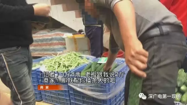 随后,记者再次来到另外一家蔬菜摊档,同样选购了两根黄瓜,商家称重同样显示的是两斤,不过当记者把自己的便携秤掏出来之后,商家这回给自己变了个戏法,说要给记者换条大的。