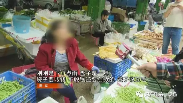 记者跟随执法人员首先来到购买了茄子的摊位,这位商家开始辩称自己的秤是被雨水给打湿了,并且表示在和记者收钱过程中,加收了塑胶袋的钱。