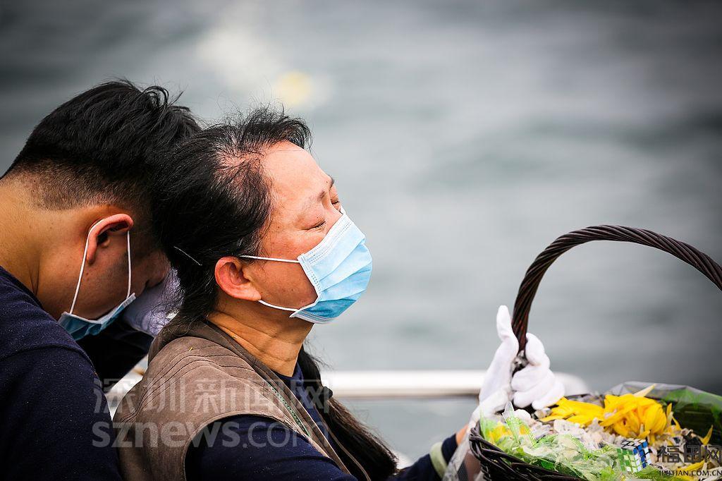 花瓣和骨灰一同撒向大海,家属为逝者默哀。