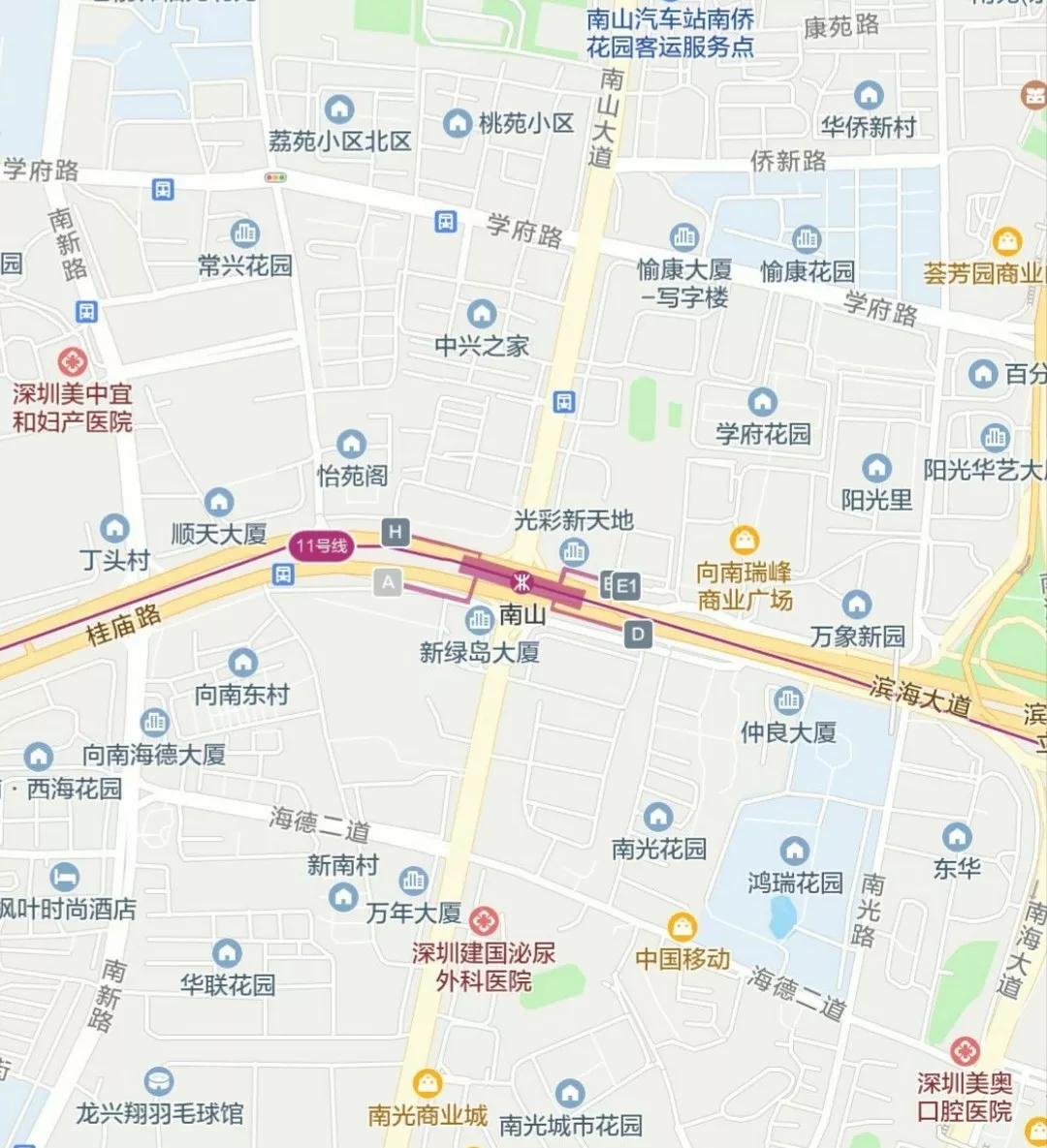 南山站总共有5个出入口,A口位于南山大道南侧、桂庙路西侧,需要乘车的市民请从D口、H口、E1口、E2口进站乘车。