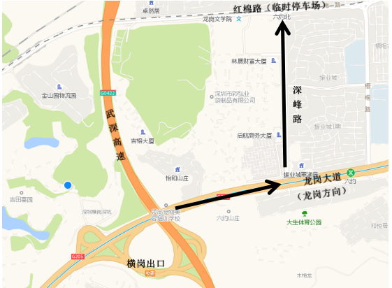 2、自市区出发路线:往龙岗大道龙岗方向行驶,在深峰路路口左转进入,经深峰路进入红棉路临时停车场,转乘接驳大巴。