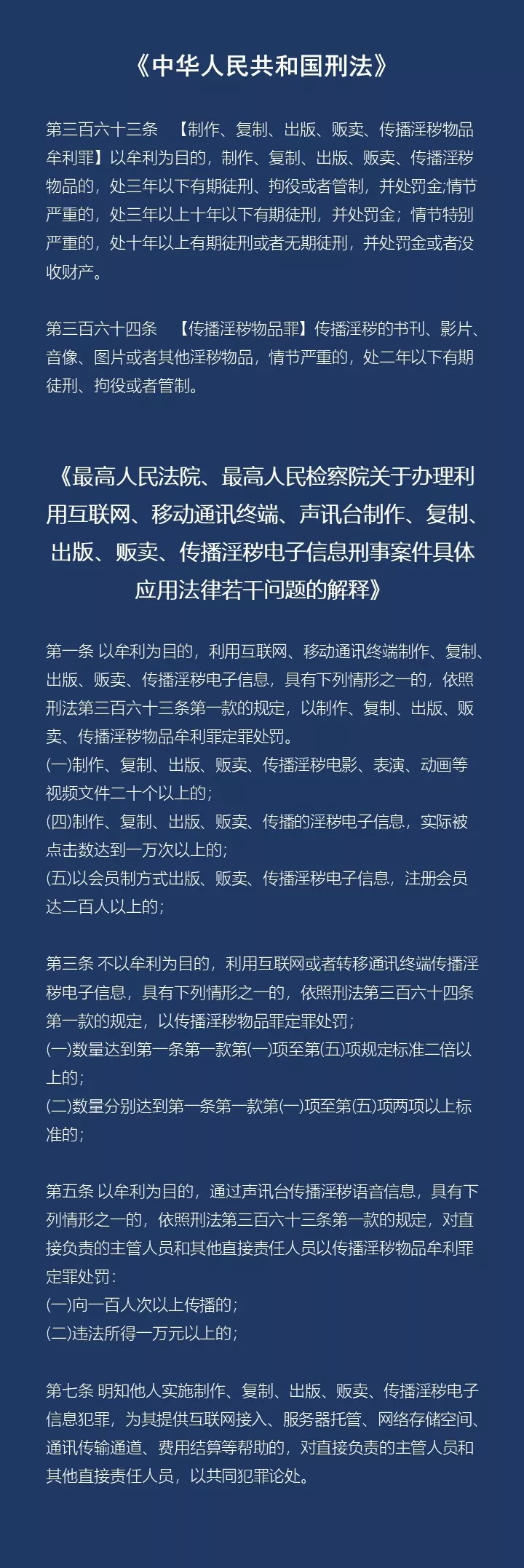 我国《刑法》规定了对传播淫秽物品牟利罪、传播淫秽物品罪的处罚,而最高法、最高检2004年9月出台的《关于办理利用互联网、移动通信终端、声讯台制作、复制、出版、贩卖、传播淫秽电子信息的刑事案件具体应用法律若干问题的解释》,又对此类犯罪认定做了详细的解释。