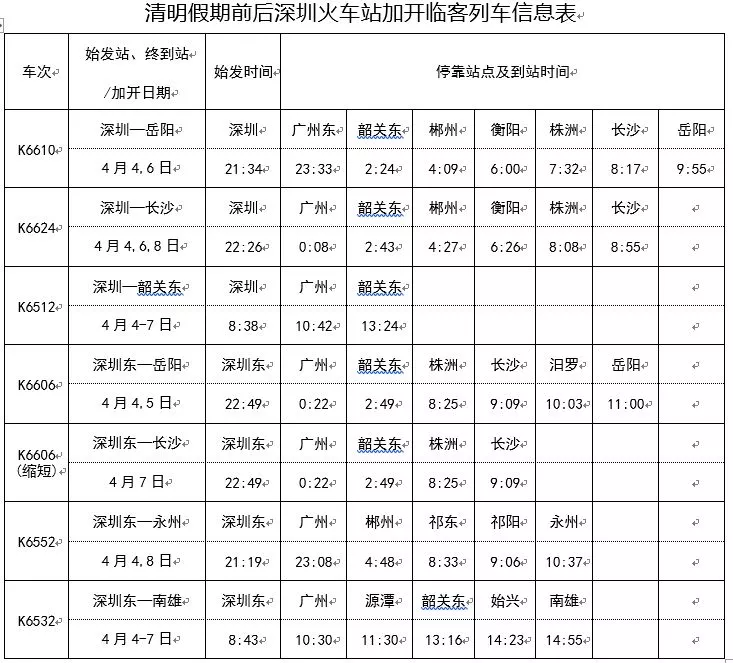 深圳站将加开3对临客列车,始发车次为开往岳阳的K6610次、开往长沙的K6624次和开往韶关东的K6512次;