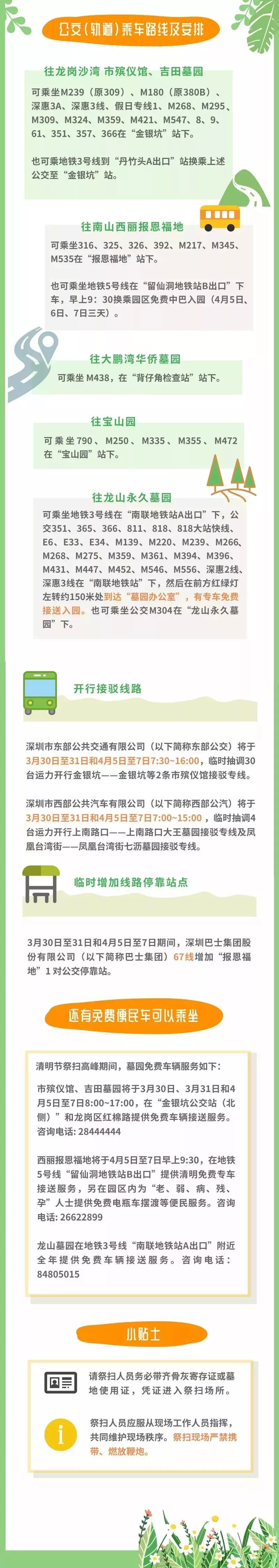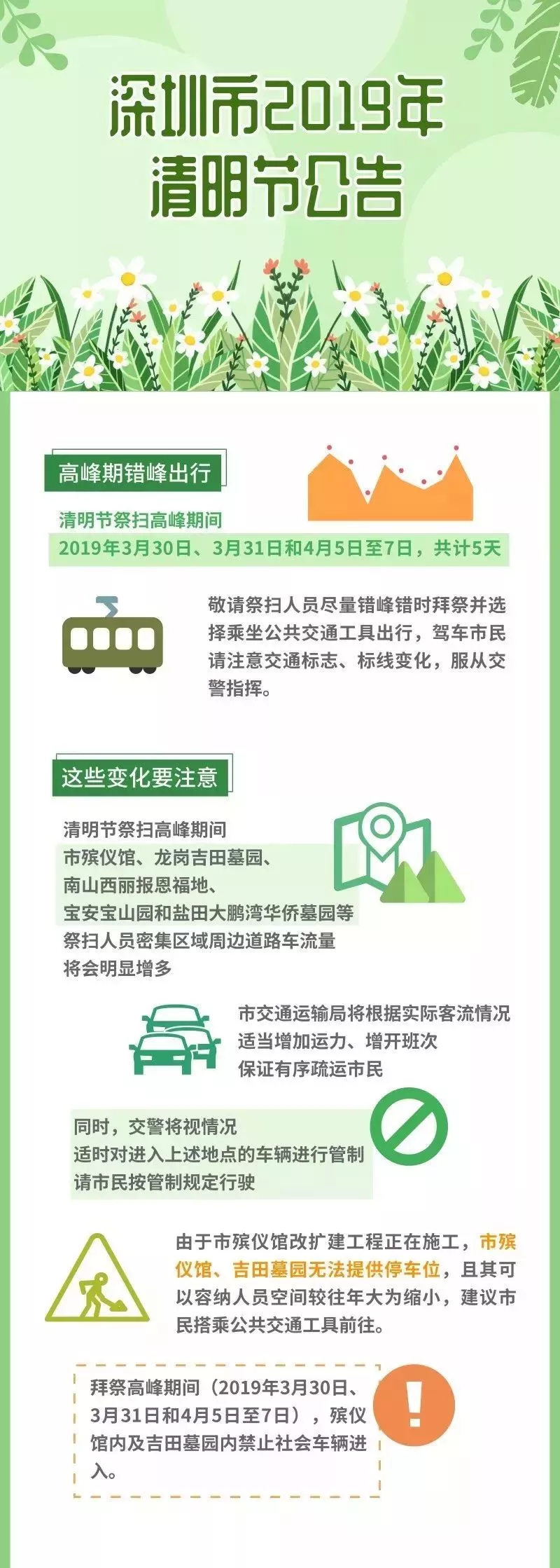 交警部门将视情况对上述地点进行交通管制,为满足市民朋友出行祭扫需要,除了给大家准备出行指引外还将开行墓园接驳专线、增加停靠站、增加运力请大家文明出行、绿色出行。
