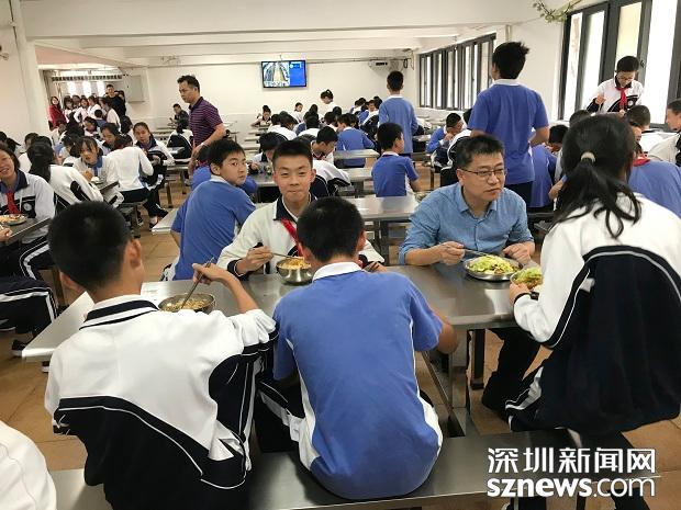 4月1日中午,深圳市福田区外国语学校校长丁长义跟学生一起在食堂就餐