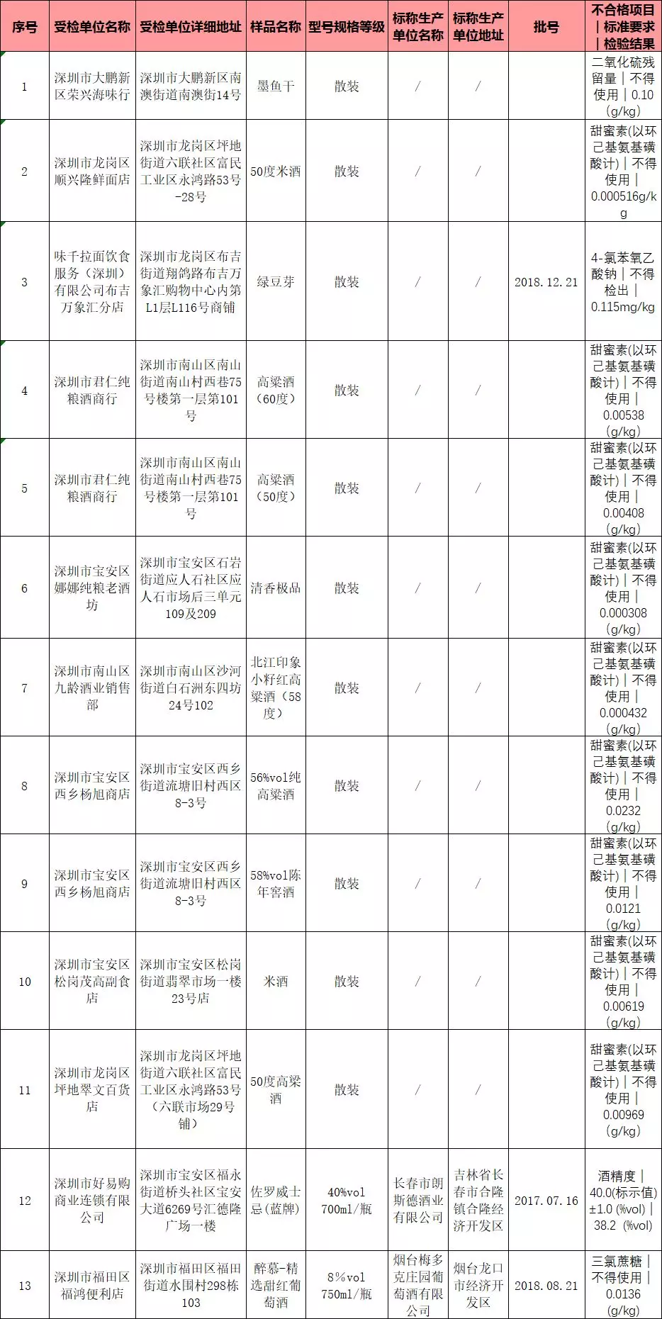 13批次不合格食品,其中酒类占了11批次,大部分原因都在于检出了甜蜜素。