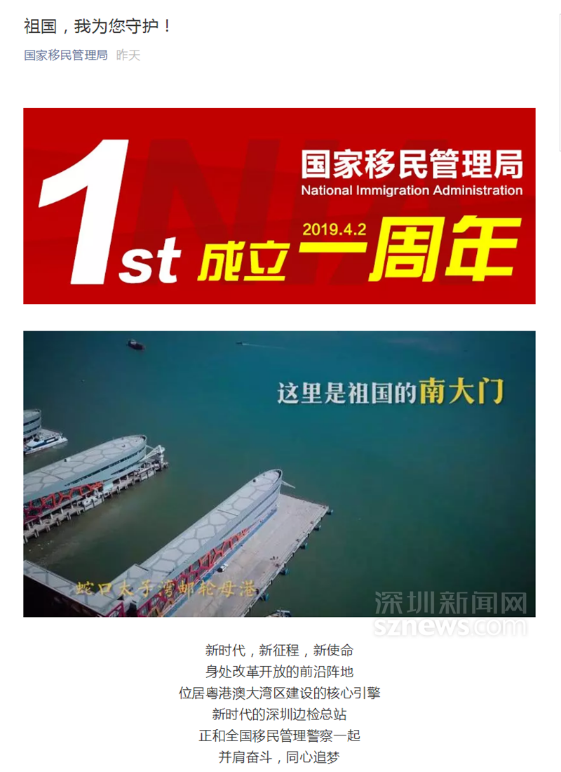 深圳新闻网4月4日讯(记者 张玲 通讯员 张铖)2019年4月2日是国家移民管理局挂牌一周年,4月3日,国家移民管理局微信公众号发布微视频《祖国,我为您守护!》。