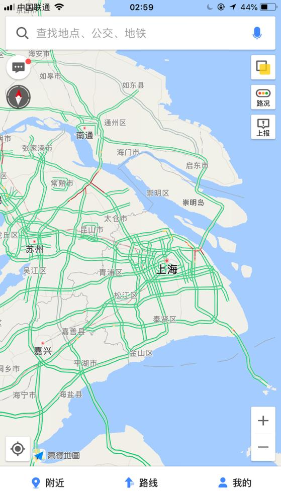 凌晨2点59分,上海周边,红色路段比较少,还算顺畅的夜晚哦。