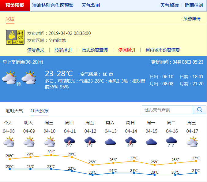 深圳新闻网2019年4月8日讯 深圳市气象台预计,本周前期我市无降雨,后期将转多阵雨天气。具体来说:8日多云可见阳光,气温23-28℃,南风2-3级,湿度55%-90%;9-10日多云为主,早晚有轻雾或雾;11日多云间阴天,傍晚或夜间转雷阵雨;12日阴天有阵雨或雷阵雨,沿海和高地阵风6-7级,气温下降;13日阴天间多云,偶有小雨。