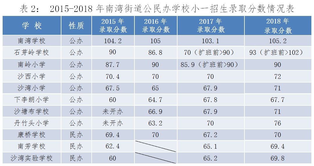 2015—2018年南湾街道公民办学校小一招生录取分数情况表