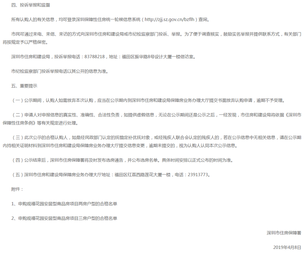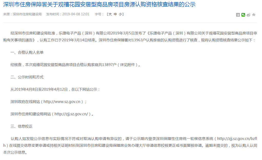 深圳新闻网2019年4月9日讯(记者 刘婷)记者从市住房保障署获悉,观禧花园安居型商品房项目认购工作已经结束。经核查,该项目合格认购家庭共13897户,合格家庭名单自4月8日至4月12日在深圳政府在线和深圳市住房(http://www.sz.gov.cn)和建设局(http://zjj.sz.gov.cn/)网站公示。