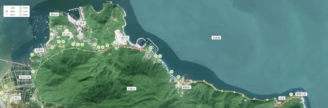 在绿道导引地图上记者看到,绿道横跨新大、东渔、东山三个社区,由西向东依次经过珍珠岛、东山码头、七星湾游艇会、桔钓沙海湾、新体育海洋运动中心、浪骑游艇会、杨梅坑景区,同时还经过闻名遐迩的高岭古村和两个承传东山渔歌、东渔天后诞非物质文化遗产的疍家渔民聚集区。