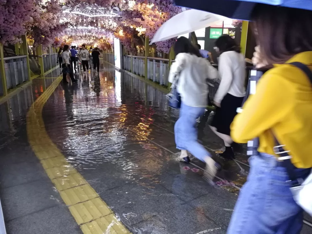 ▲地铁口一路踩水坑回家的市民(记者邱晓洁摄)
