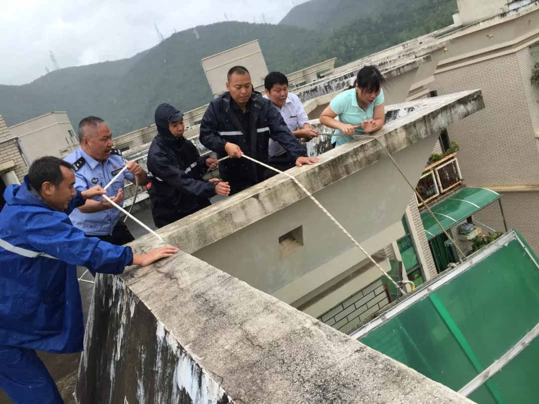 ▲2017年8月23日中午,在福田区梅林一村88栋,一家住户的靠墙阳台顶蓬固定支撑点已全部脱落,导致整个顶蓬向外倾斜,十分危险,福田公安分局梅林派出所民警联合社区居民一起现场处置。