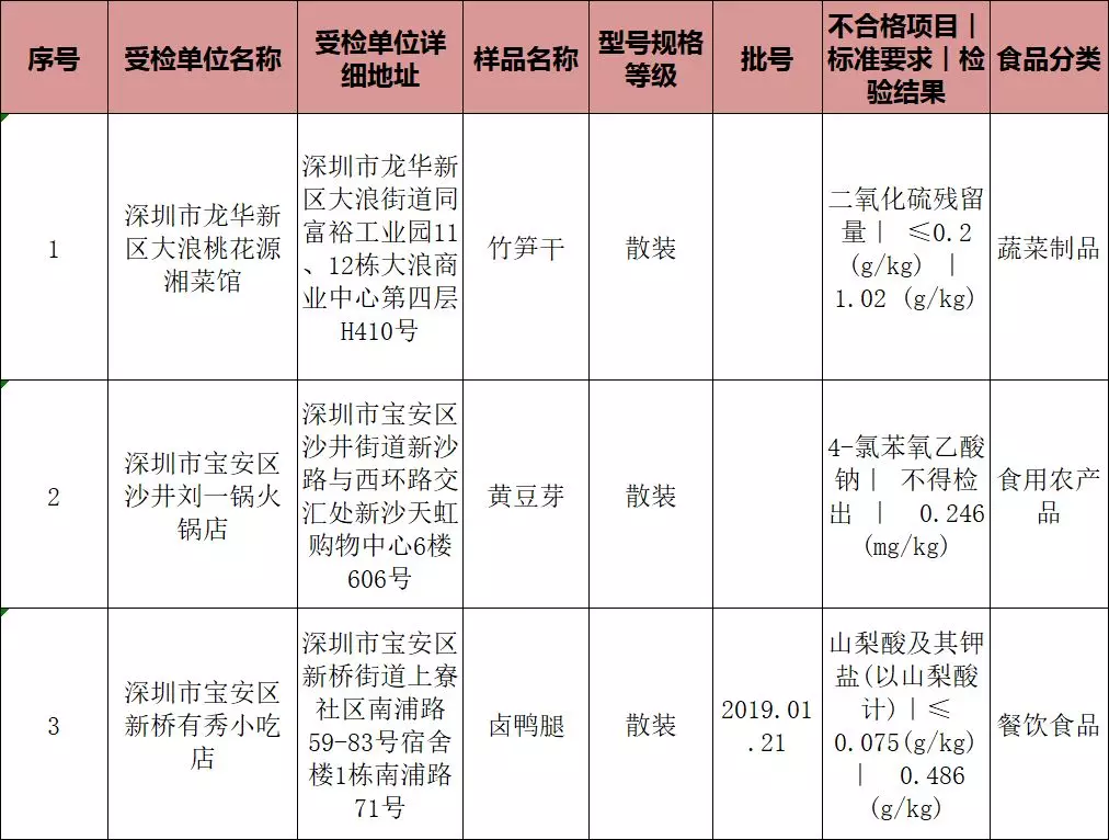 号外!号外! 深圳市宝安区新桥街道 有一批次卤鸭腿 被深圳市市场监督管理局盯上了! 在深圳市市场监督管理局 发布的最新一期 食品抽检通报中 有3批次不合格样品 其中有1批次就是卤鸭腿!!! 不信你看 2019年食品安全抽样检验情况通报 (第十四期) 本次共抽检餐饮环节食品657批次,涉及餐饮环节经营主体465家次,共检测食品指标3422项次。其中检出不合格样品3批次,涉及不合格食品类别有餐饮食品1批次,食用农产品1批次,蔬菜制品1批次;涉及不合格项目类别为非食用物质、食品添加剂。 本次抽检不合格食品 具体信息如下 这不合格表单,食安君一眼就看到了卤鸭腿!这批次不合格卤鸭腿出自深圳市宝安区一家叫新桥有秀的小吃店,不合格项目是山梨酸及其钾盐(以山梨酸计)超标。 这绕口的山梨酸及其钾盐(以山梨酸计)到底是啥? 山梨酸及山梨酸钾是食品防腐保鲜剂,具有广泛的抑菌效果和防霉性能。《食品安全国家标准食品添加剂使用标准》(GB2760-2014)中规定,山梨酸及其钾盐(以山梨酸计)在熟肉制品中最大使用量为0.075g/kg。 山梨酸可以被人体的代谢系统吸收而迅速分解为二氧化碳和水。但如果长期食用山梨酸超标的食品,可能会对人体的骨骼生长、肾脏、肝脏健康造成一定影响。 蔬菜制品和食用农产品 也分别有1批次被检出不合格 蔬菜制品1批次 食用农产品不合格样品为黄豆芽,不合格受检单位是深圳市宝安区沙井刘一锅火锅店,不合格项目为4-氯苯氧乙酸钠。 4-氯苯氧乙酸是一种植物生长调节剂,由于其对人体有一定积累毒性,有关部门已取消其作为食品添加剂的生产许可申请。 《关于豆芽生产过程中禁止使用6-苄基腺嘌呤等物质的公告》(国家食品药品监督管理总局、农业部、国家卫生和计划生育委员会公告2015年第11号)中要求,豆芽中禁止使用4-氯苯氧乙酸。豆芽作为一种食用量非常大的蔬菜,4-氯苯氧乙酸钠残留在人体内累积所产生的有害作用应予以重视。 不过大家不用太担心 深圳市市场监管局已经 对本次抽检不合格的产品 采取了行政控制措施 防止不合格产品进一步流入市场 而且,不合格只是少数 还有更多合格的食物等我们呀 想知道本次抽检合格食品的具体信息? 可以在对话框回复 “2019食品抽检第十四期” 获得官网链接下载详细的信息表格~ 最后 食安君还是要提醒大家 外出就餐要到证照齐全 环境卫生的餐馆 学会看“笑脸”选餐厅 不选择无证或卫生环境差的路边摊 不要购买公布的不合格产品哟~ 永不落幕的食安科普 编辑整理:深圳食事药闻 转载请注明以上内容
