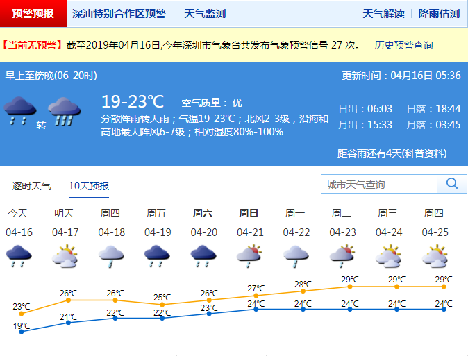 市气象局预计17日降雨减弱,阵雨转多云;18-20日,天气仍不稳定,多雷雨。21-22日,降雨趋于减弱。深圳市气象台2019-04-1605:36:00发布。