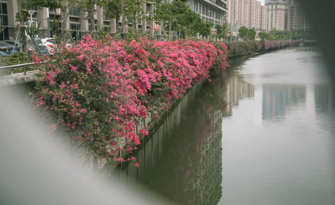 经过宝安人不懈的努力,西乡河已不见了黑臭的身影,此时盛开的红色、紫色勒杜鹃清晰地倒映在河面上。
