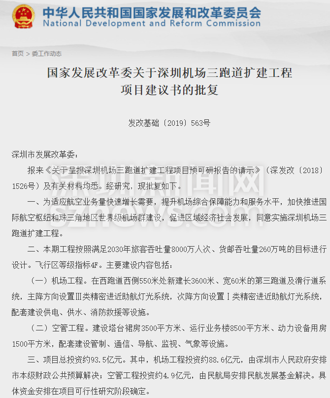 国家发展改革委关于深圳机场三跑道扩建工程项目建议书的批复截图