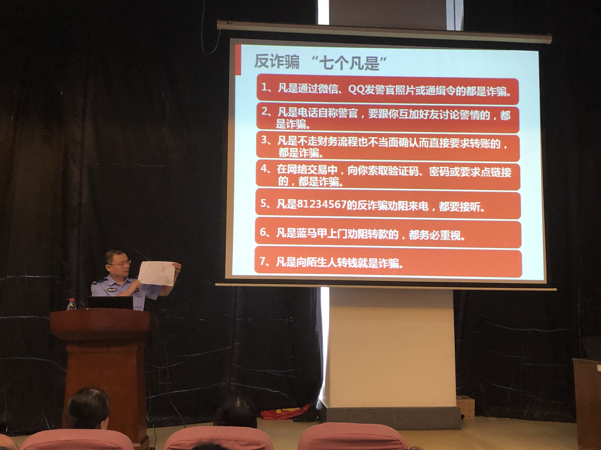 4月12日下午,惠杰副所长、社区民警黄旭波、孙立波在财富广场小礼堂开展香蜜湖“反诈骗课堂”第一场,向财富广场各公司负责人、财务人员开展反诈骗宣传,“反诈骗宣传”PPT包含反诈骗工作面临的严峻形式、电信诈骗的常见手段、各类案例及宣传视频、电信诈骗的防范要点、以及社区民警的微信二维码名片等等。此次宣传借用大厦的会议室、物业单位的小礼堂,将本楼的商户、公司集中在一起,形成区域效应;突出重点人员,主要针对单位负责人、财务人员,切实提高居民自我防范意识。