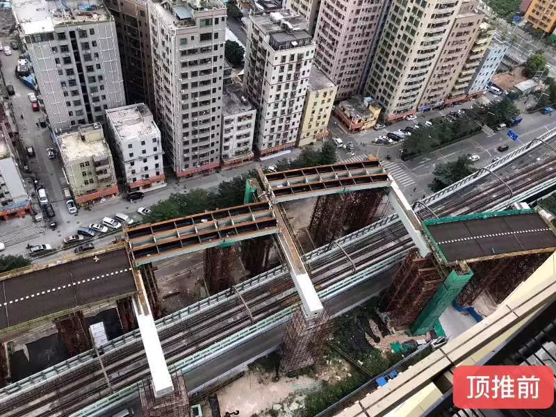 深圳地铁6号线一期的红山站至上塘北站区间由中铁建大桥局承建,上跨正在运营的地铁4号线,两条线最近处仅相隔1.2米。本次顶推高架为4孔30米双线简支钢混结合梁,采用依次整体横向顶推的方式,单孔梁重430吨,最大顶推距离17米,斜跨段平曲线半径为450米,交叉角达30度。第一孔简支钢混结合梁于3月3日开始顶推,历时22天,最后一孔于25日完美收工。