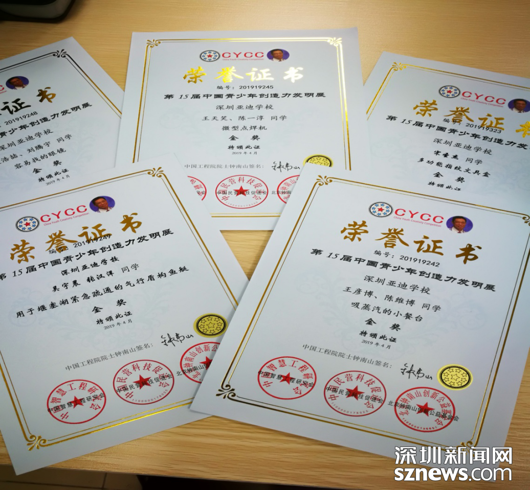 据了解,深圳亚迪学校有13名学子携9个项目参赛,五个项目获金奖,金奖证书9个,四个项目获银奖,银奖证书8个,获中国青少年创造力大赛钟南山创新奖奖牌15块,另有3人获网络人气评选创造力先锋奖,网络人气评选创造力新星奖,网络人气评选最佳创造力之星奖。
