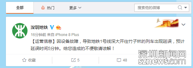 这周的星期一,深圳地铁1号线深大开往竹子林列车延误