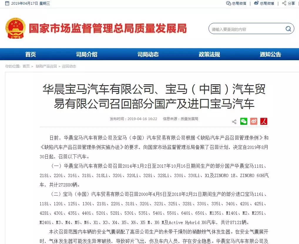 据国家市场管理总局质量发展局官网,日前,华晨宝马汽车有限公司及宝马(中国)汽车贸易有限公司根据《缺陷汽车产品召回管理条例》和《缺陷汽车产品召回管理条例实施办法》的要求,向国家市场监督管理总局备案了召回计划,决定自2019年8月30日起,召回以下汽车: